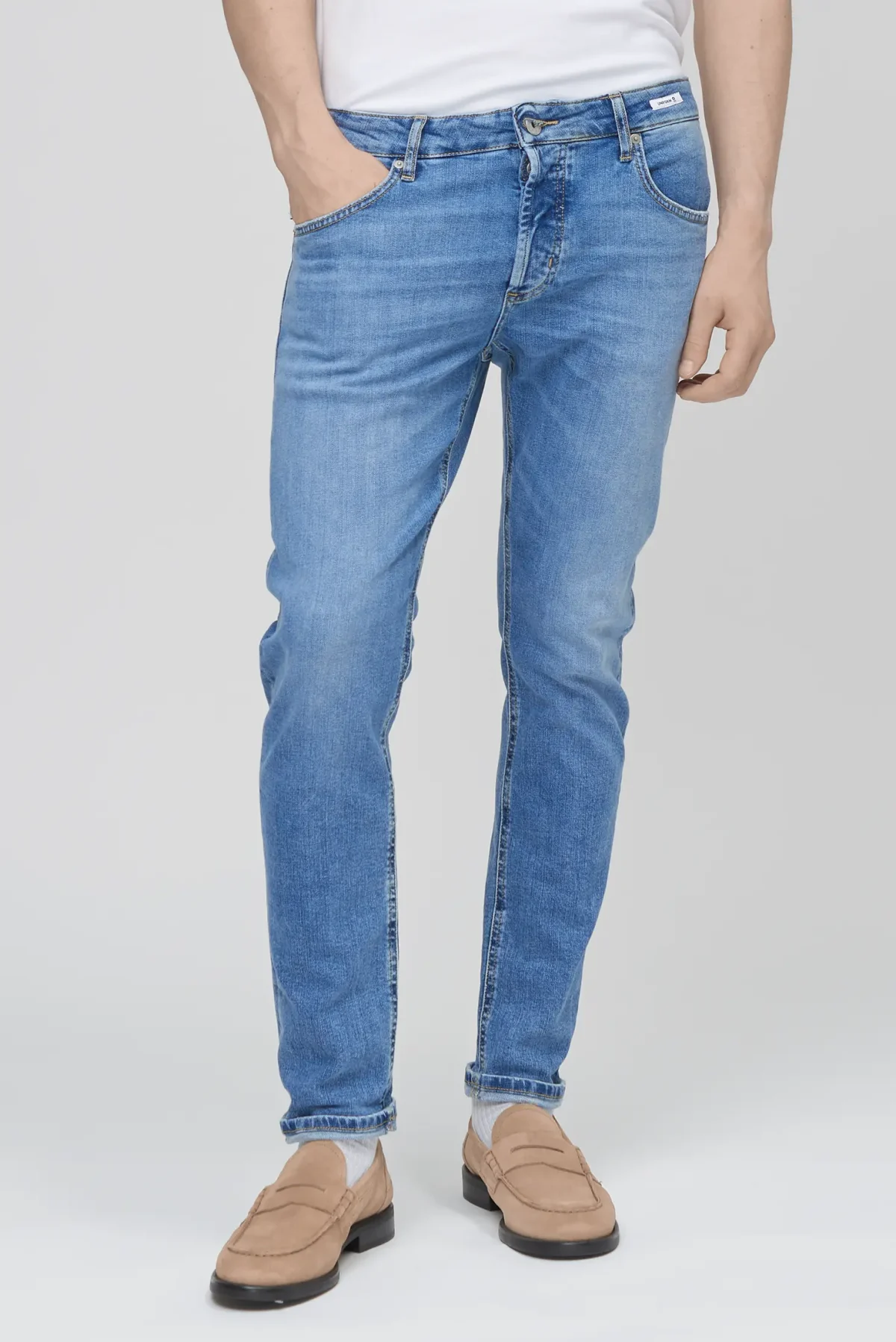 Five-pocket jeans in Mid Blue Denim with a regular fit cut, designed to offer the perfect balance of comfort, durability, and timeless style. The Barney Regular is a contemporary reinterpretation of classic denim, ideal for those who want a well-proportioned, easy-to-wear silhouette suitable for everyday use.